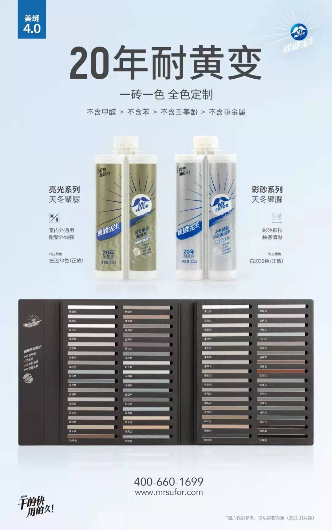 1. 颜色丰富。速缝先生共两款双组份美缝剂,亮光和亚光各30个颜色,共计60个颜色,让您选择更丰富,能轻松搭配各式各样的瓷砖。