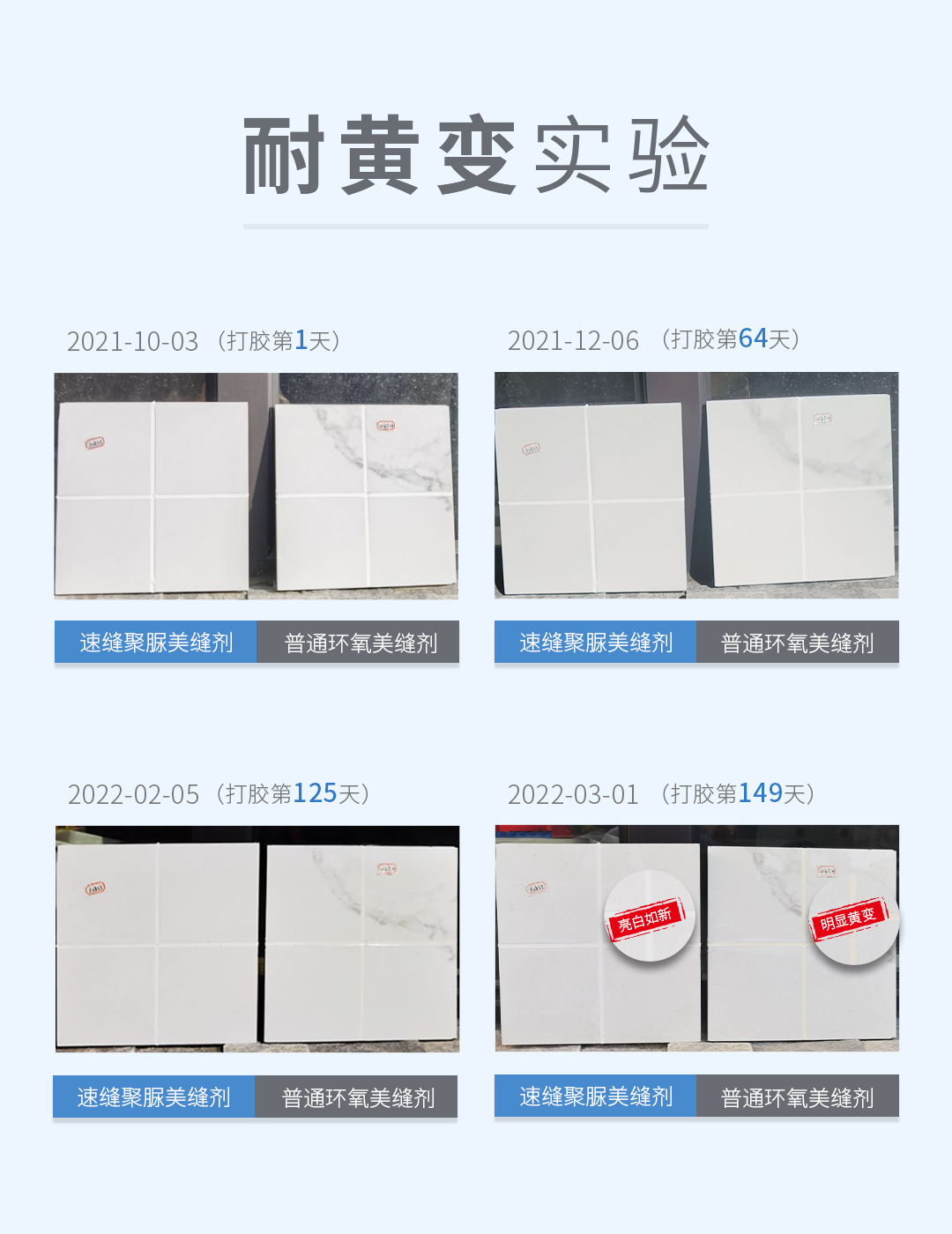 即便是室外阳光暴晒下,速缝先生聚脲美缝剂仍能做到不黄变,亮白如新。这样的优异性能取决于美缝行业原料的进步和研发,所以喜欢白色或浅色系美缝剂的业主都可以放心使用速缝先生聚脲美缝剂!