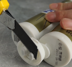 切开后即可对准切口安装胶管,装上去后要将胶管顺时针旋转,让胶管的卡扣卡住瓶口,才能保证使用的时候不脱落。