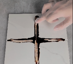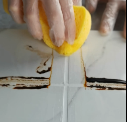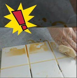 用一个简单地小实验来看看速缝先生美缝剂的抗污力,把酱油均匀的涂抹在白色的美缝剂上,等其干透。