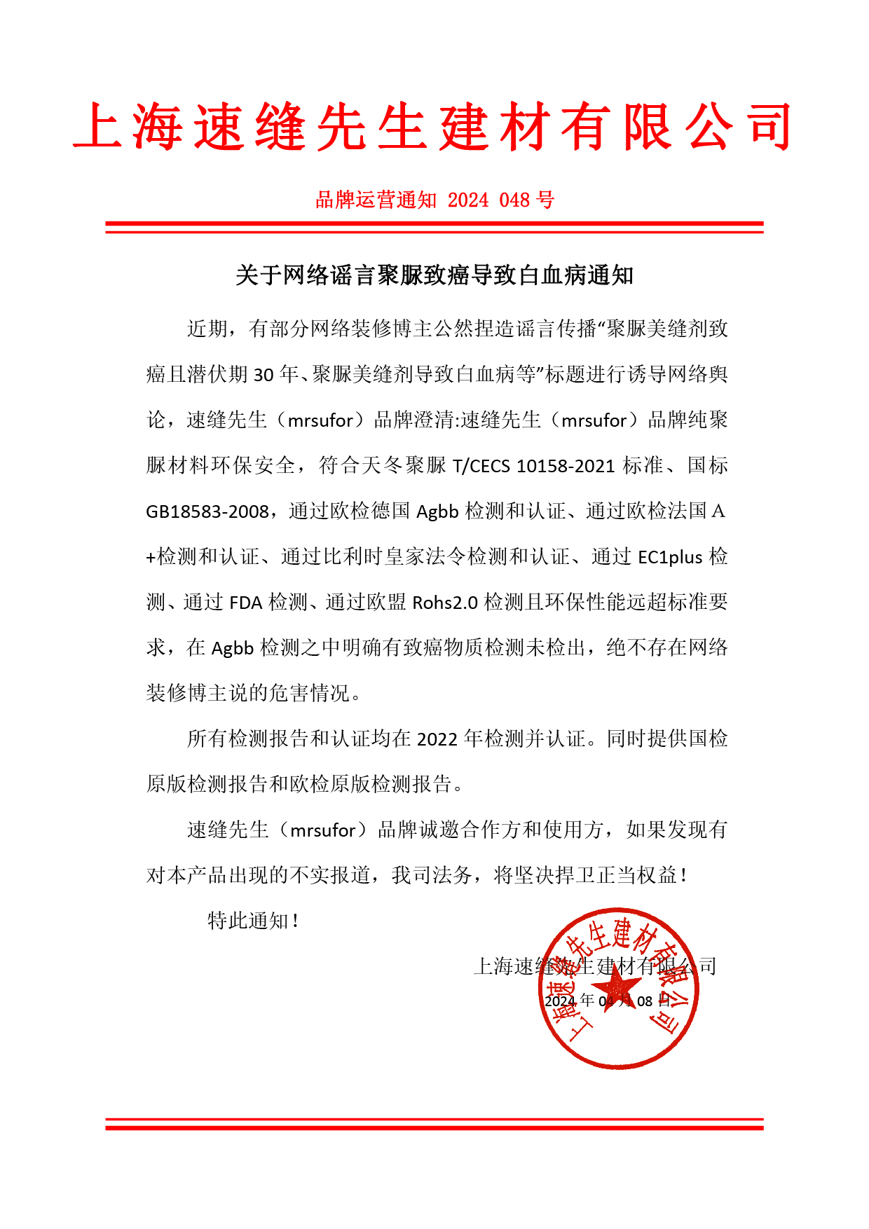 官方声明:速缝先生聚脲美缝剂经过严格检测,确认无毒!