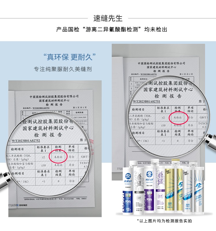 聚脲美缝剂的优秀性能我们有目共睹,但是为了美缝市场的健康,大家也要注意真伪聚脲产品的甄别,速缝先生品牌承诺产品所有的检测报告均可提供原件,无造假数据,真实可查。